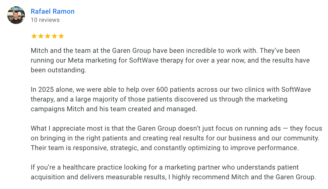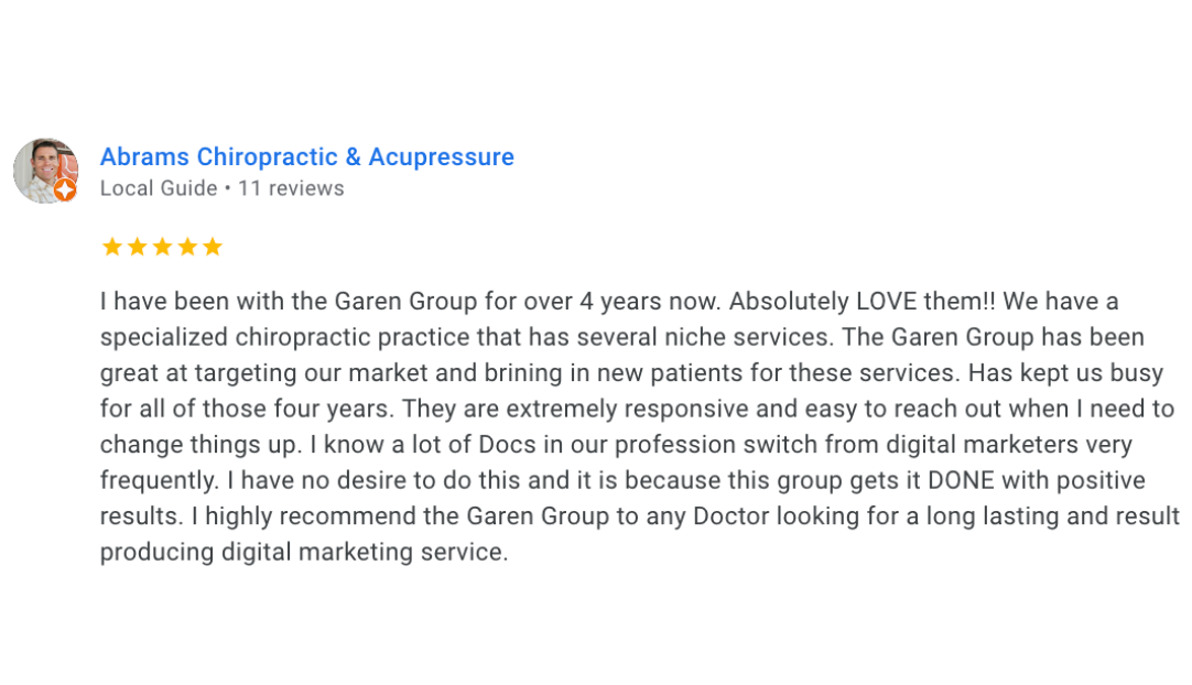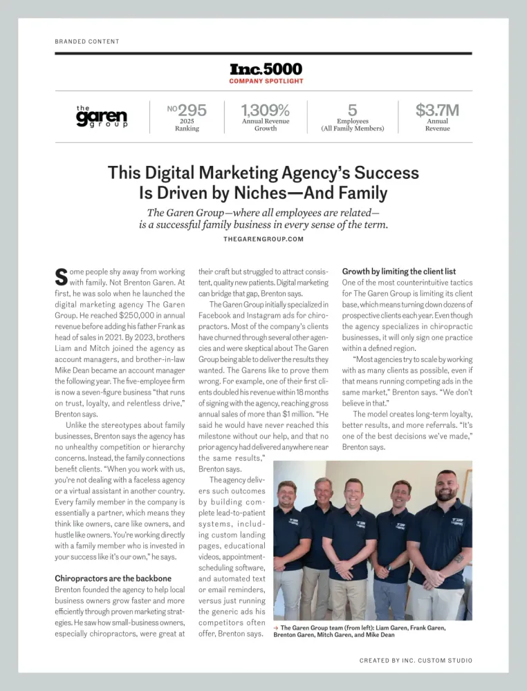 The Garen Group is a family-owned and operated digital marketing agency dedicated to helping Chiropractors, Aesthetic Clinics & Med Spa owners grow their practices through proven patient acquisition strategies.